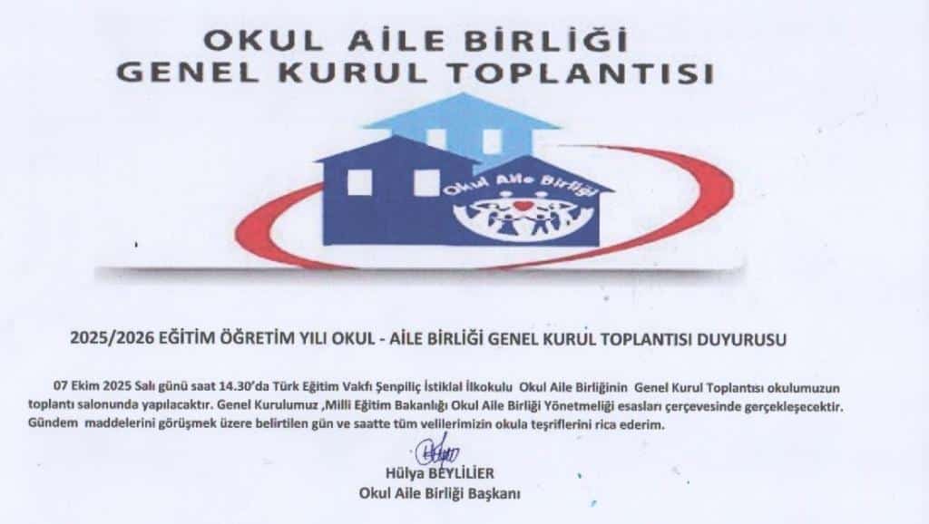 2025/2026 Eğitim Öğretim Yılı Okul Aile Birliği Genel Kurul Toplantısı 07/10/2025 Salı Günü 14.30'da okulumuz toplantı salonunda yapılacaktır. Tüm velilerimiz davetlidir.